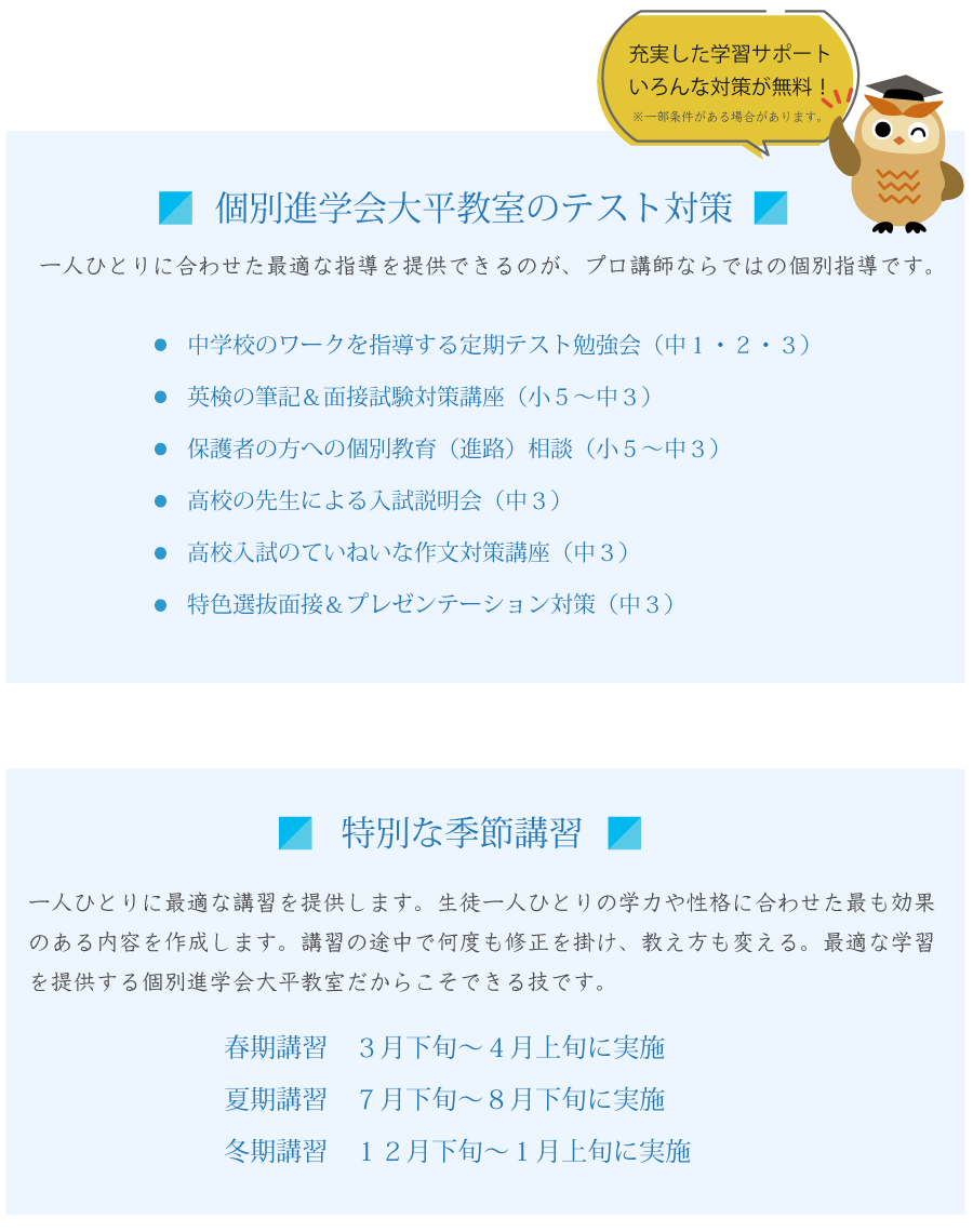 中学校の学習進度に合わせ、一人ひとりの学力に応じた中間・期末テストによく出る問題を個別指導を受けて、得点力をアップさせます。また検定日の直前には英検対策も実施し、合格へと導きます。